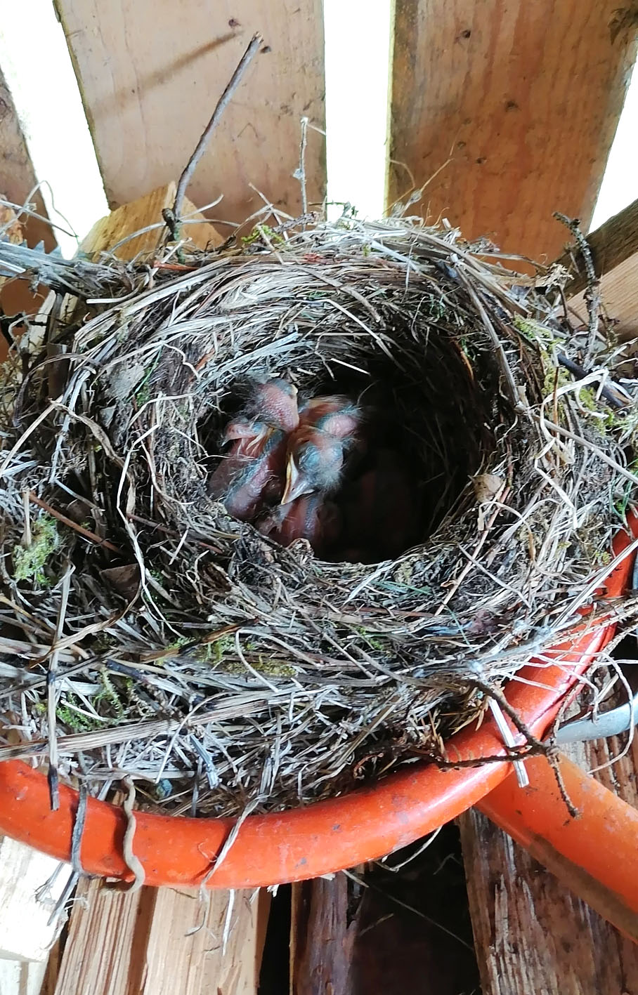Kaikki hyvin. Tuo lintupesue on mustarastasperhe. Vanhemmat, uskoakseni pesällä molemmat käyvät, hoitavat ja ruokkivat edelleen kasvavia poikasiaan. Tarkistan.