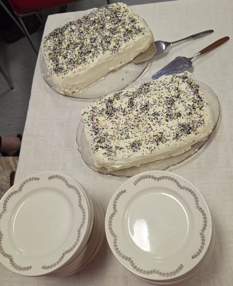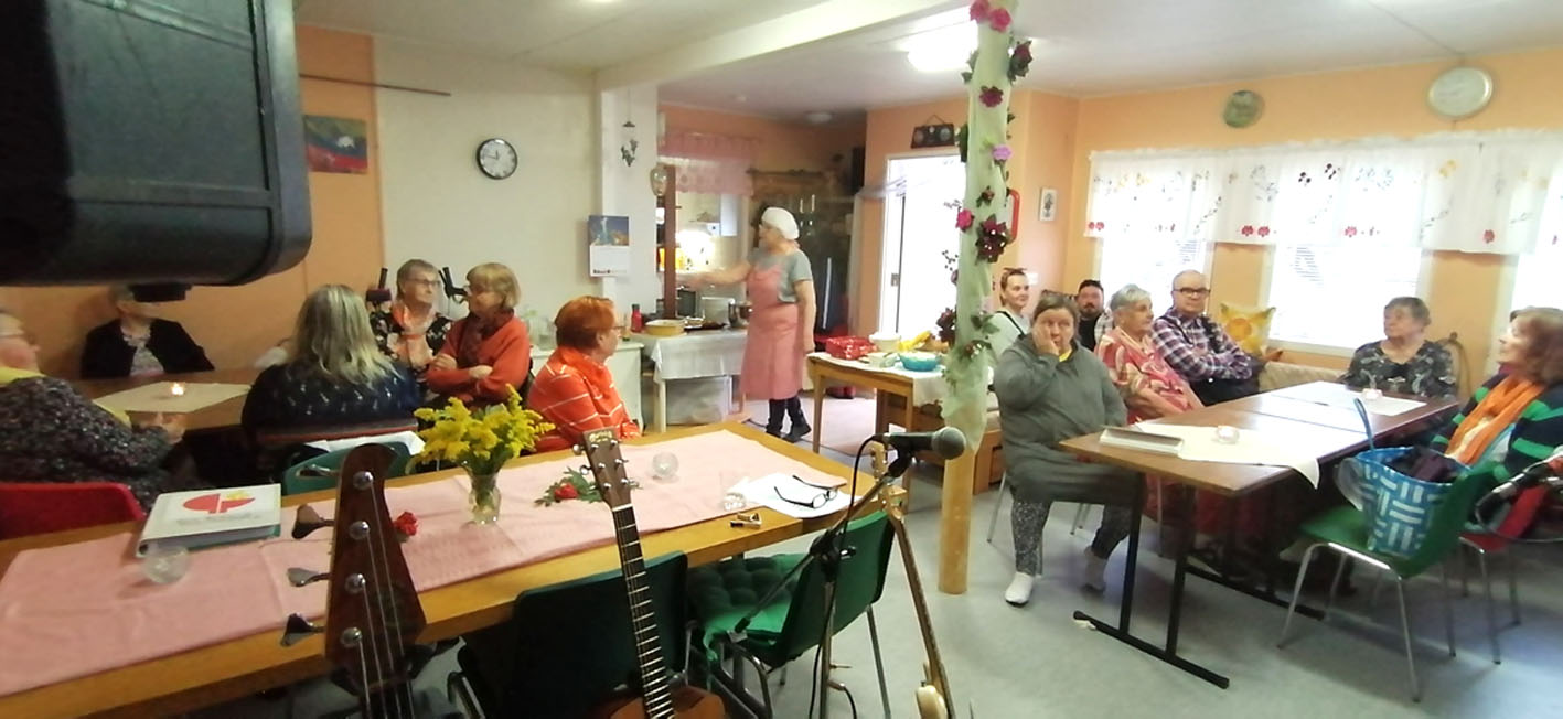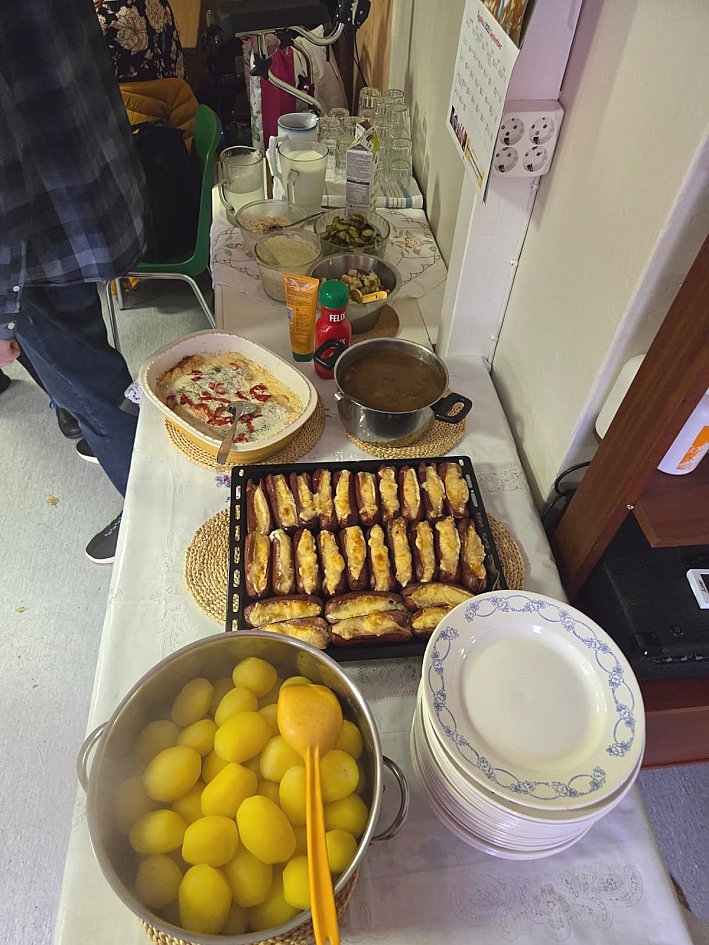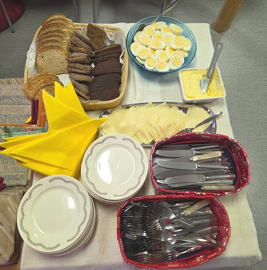 Kuntoharjun päivän vakio-ohjelmaan kuului tälläkin kertaa maittavaa ruokaa. Emäntä oli loihtinut monenlaista tarjottavaa. Ruoka oli hyvää ja sitä oli riittävästi. Myös päiväkahvit kera täytekakun tekivät kauppansa. Kaupasta sen verran, että ”tarjouksella” tarjottiin.